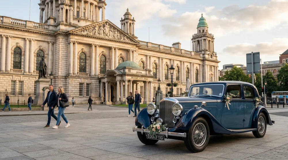 Serving Belfast Castle, Stormont, St Anne's Cathedral, Botanic Gardens, and Hillsborough Castle. Heritage events, weddings, and photo shoots. Belfast has no Clean Air Zone — classic vehicles welcome everywhere.