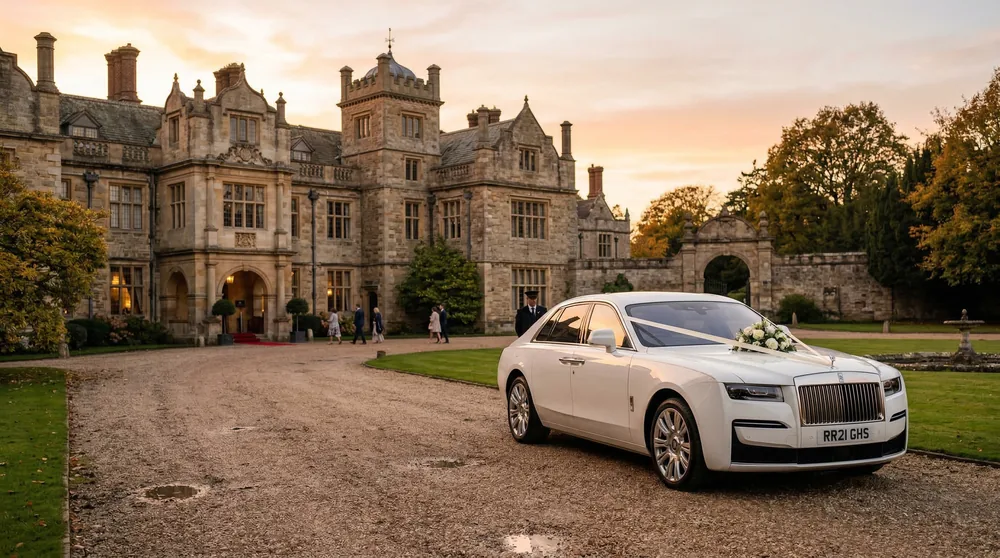 Nailcote Hall sits in the rolling Warwickshire countryside near Berkswell, roughly 8 miles south-west of Coventry. The 17th-century manor house offers a romantic ceremony setting with its oak-panelled rooms and award-winning gardens. We provide arrival and departure transfers, bridal party shuttles from Coventry hotels, and post-reception evening car service. A Rolls-Royce Ghost or Bentley Bentayga completes the stately approach.