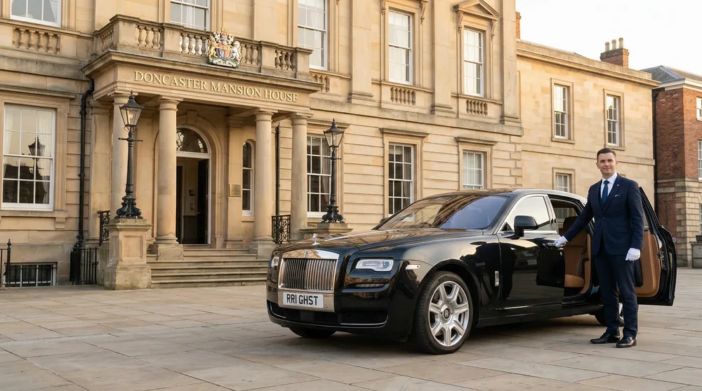 Doncaster is home to the world's oldest Classic horse race — the St Leger Stakes, run at Doncaster Racecourse every September since 1776. Our chauffeur fleet brings Rolls-Royce, Bentley, and Mercedes-Benz vehicles directly to your door, whether you're heading to the Racecourse, hosting clients at Owston Hall Hotel, or transferring executives to or from East Midlands Airport (EMA). Doncaster has no Clean Air Zone, so our vehicles operate across the entire city without surcharge. For business events at Lakeside Business Park — South Yorkshire's largest commercial development — or corporate entertaining at Warmsworth Hall, our uniformed chauffeurs provide the professional first impression your guests deserve.