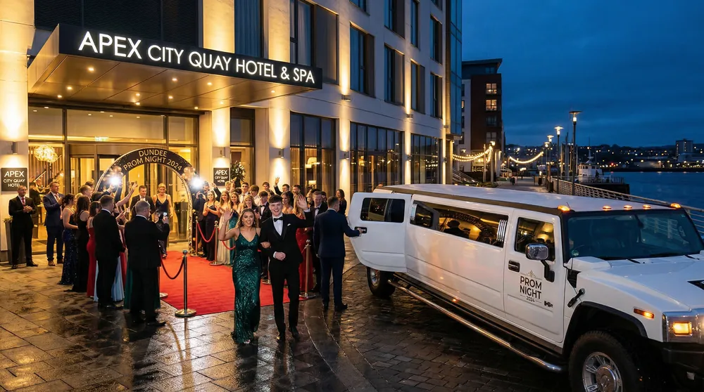 Stretch Lincoln (8) or Hummer (16) for group arrivals. Multi-address pick-up across Dundee.