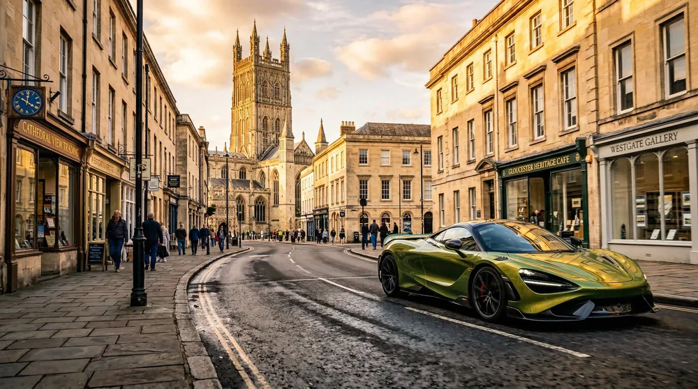 Gloucester sits at the crossroads of three of South West England's finest driving regions — the ancient Forest of Dean lies 15 minutes west on the A40, the Cotswold escarpment unfolds to the east via the B4073 through Painswick, and the Severn Vale stretches south toward Bristol Airport (BRS), 35 miles from the city centre. LuxuryCarHire.Club delivers Ferrari, Lamborghini, and McLaren supercars directly to Gloucester Cathedral, Hatherley Manor Hotel, or any address across Gloucestershire. With no Clean Air Zone in Gloucester, you can cruise freely through the historic city centre and beyond. Whether you are heading west into the Forest of Dean's woodland switchbacks or east toward the honey-stone Cotswold villages, Gloucester is an exceptional base for a supercar hire day or weekend.