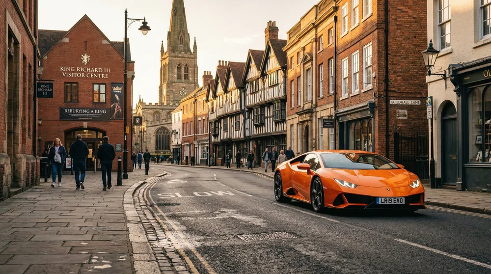 Leicester sits at the heart of England with exceptional supercar country on every side. Collect your Lamborghini, Ferrari, or McLaren from East Midlands Airport (EMA) — just 15 miles south of the city — and head straight to the B5330 through Bradgate Park or the undulating circuit of Rutland Water for a drive that stays with you. Leicester has no Clean Air Zone, so you're free to enjoy every rev from the moment of handover without penalty. King Richard III's city makes an unlikely but brilliant base for some of England's most rewarding supercar roads.