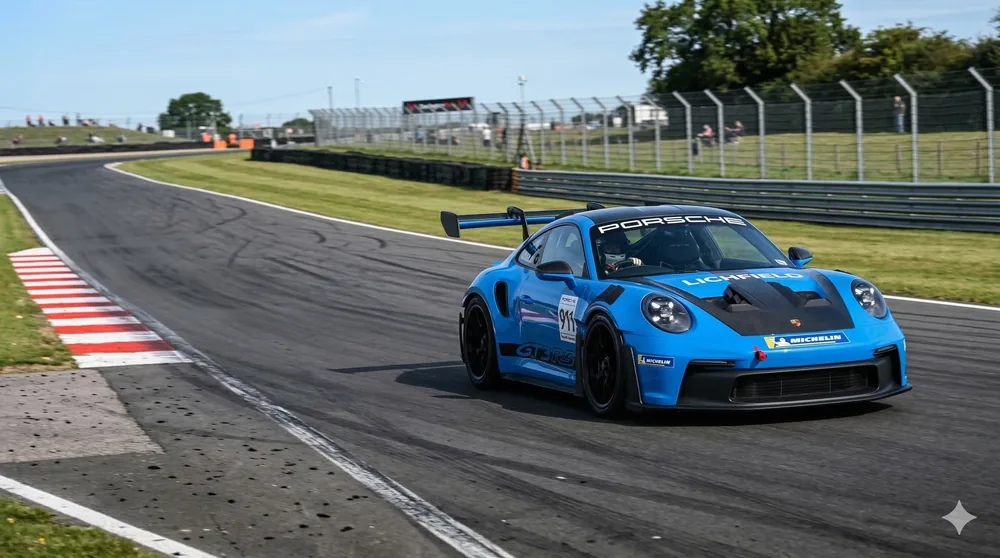 525 hp naturally aspirated 4-litre flat-six, rear-wheel drive, PDK transmission, active rear-wing aerodynamics. The GT3 RS is what Porsche builds when the road is incidental. At Tamworth's technical corners or Mallory Park's fast sweepers, its carbon-ceramic brakes and adaptive chassis reward every degree of commitment from the first lap to the last.