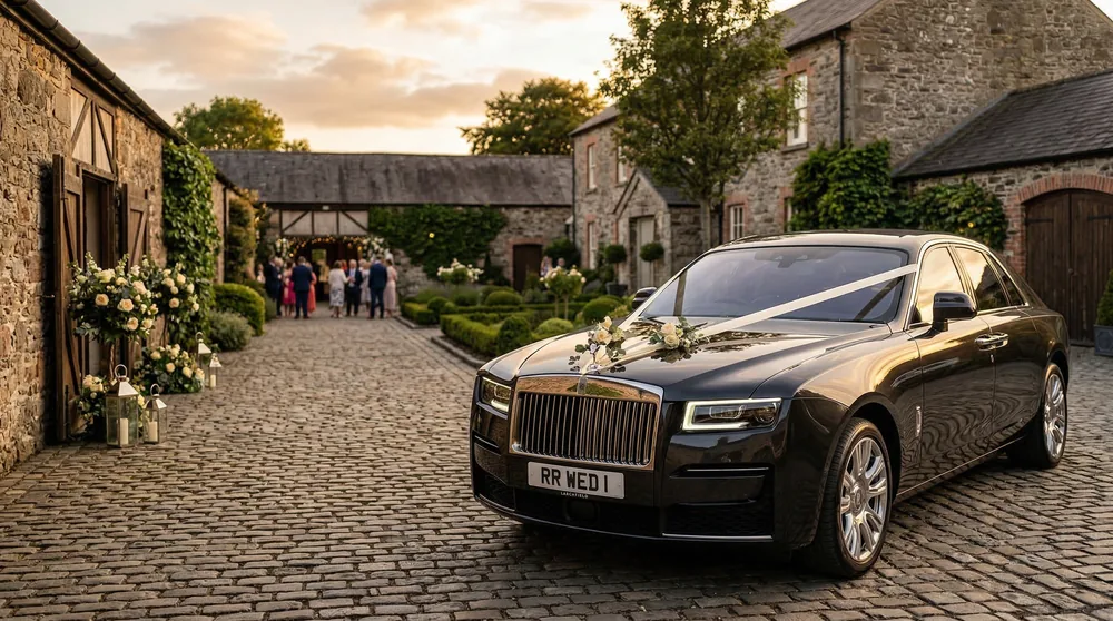 Our Lisburn wedding fleet includes the Rolls-Royce Ghost (from £1,200/day), Rolls-Royce Cullinan (from £1,400/day), Bentley Continental GTC (from £1,100/day), Bentley Flying Spur (from £1,100/day), Mercedes-Maybach S-Class (from £950/day), and the Rolls-Royce Silver Cloud for vintage-style ceremonies. Each vehicle arrives professionally detailed with ribbon decoration in your chosen colour scheme. Our chauffeurs coordinate with venue event managers at Larchfield Estate, Hillsborough Castle, La Mon Hotel, Brook Hall Weddings, and Millbrook Lodge to ensure timed arrivals that match your ceremony schedule. Flower arrangements and champagne service available on request.