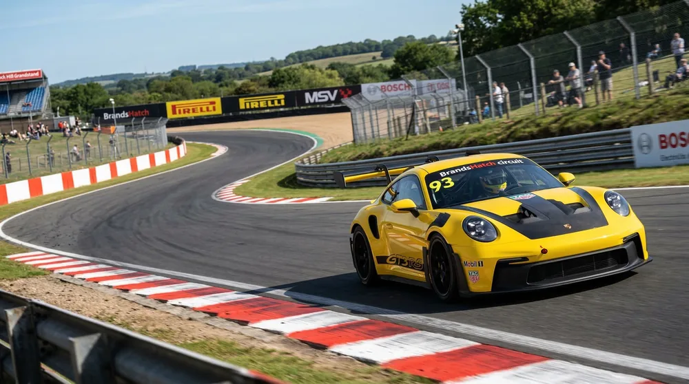 Brands Hatch in Kent is 20 miles southeast of London via the M25 and A20 — approximately 45 minutes from central London. The Indy circuit (1.2 miles) and GP circuit (2.4 miles) host track days throughout the season. The GP circuit’s Paddock Hill Bend is one of the most dramatic corners in British motorsport — a blind, downhill entry that rewards commitment. The Porsche 911 GT3 RS handles Brands Hatch’s undulating layout with precision.