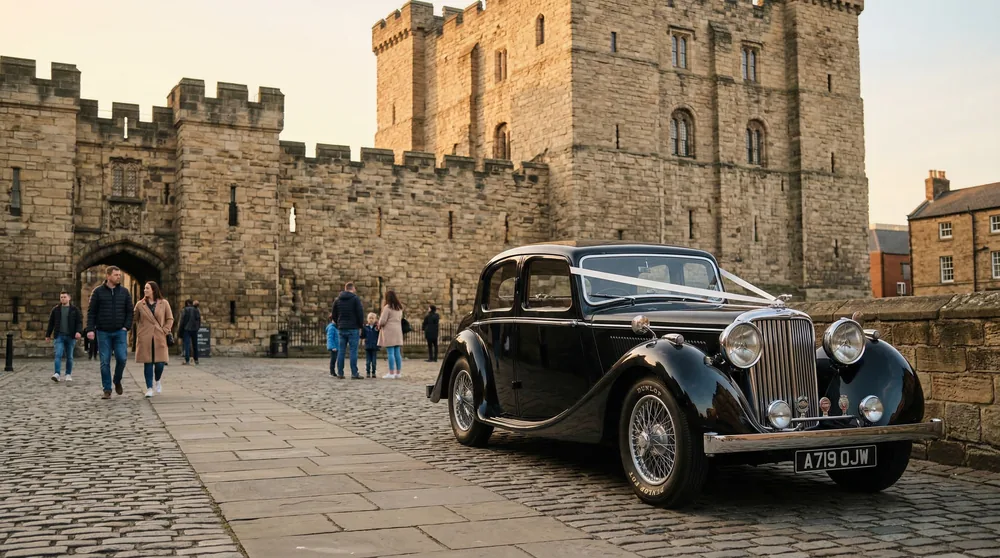 Our vintage car service covers all wedding and event venues across Newcastle upon Tyne and Northumberland. Core venue coverage includes Matfen Hall, Linden Hall, Jesmond Dene House, Vermont Hotel, Kirkley Hall, Wynyard Hall, Newcastle Castle, Grey Street, Tyne Bridge, and BALTIC Centre. Collection from home addresses across Jesmond, Gosforth, Darras Hall, Ponteland, Tynemouth, Whitley Bay, Corbridge, Hexham, and Morpeth is included. Extended coverage to Sunderland, Durham, and Northumberland coast venues is available at confirmed pricing. View our full collection and delivery coverage.
