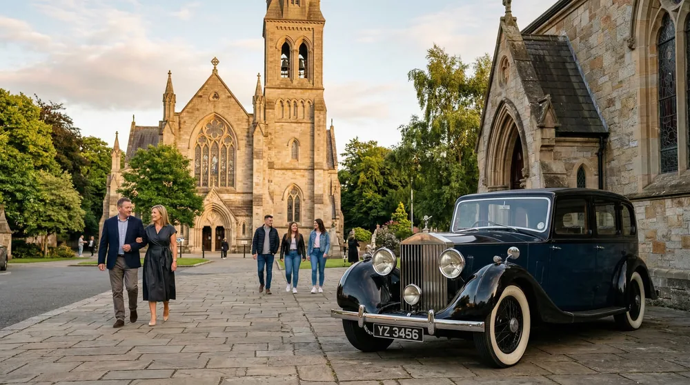 Newry Cathedral, St Patrick's Church, and parish churches across the district provide traditional ceremony settings that demand a vehicle of equivalent dignity. The Silver Cloud or Bentley S-Type arriving at the church entrance, ribbon-dressed and gleaming, creates the ceremony-day image that defines a wedding album. Our chauffeur manages door-opening, umbrella service, and bridal party positioning with practised discretion.