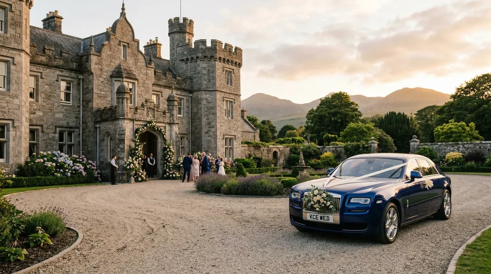 LuxuryCarHire.Club provides wedding car hire across Newry and the Mourne region from £1,400 per event. Arrive at Killeavy Castle Estate in a Rolls-Royce Phantom, depart Canal Court Hotel in a Bentley Continental GTC, or make your entrance at the Slieve Donard Resort in a Rolls-Royce Ghost. Newry and the surrounding Mourne region host hundreds of weddings annually across venues from the Ring of Gullion to the coast at Newcastle, and our chauffeur-driven fleet is presented with ribbon decoration, uniformed driver, and full photography coordination.