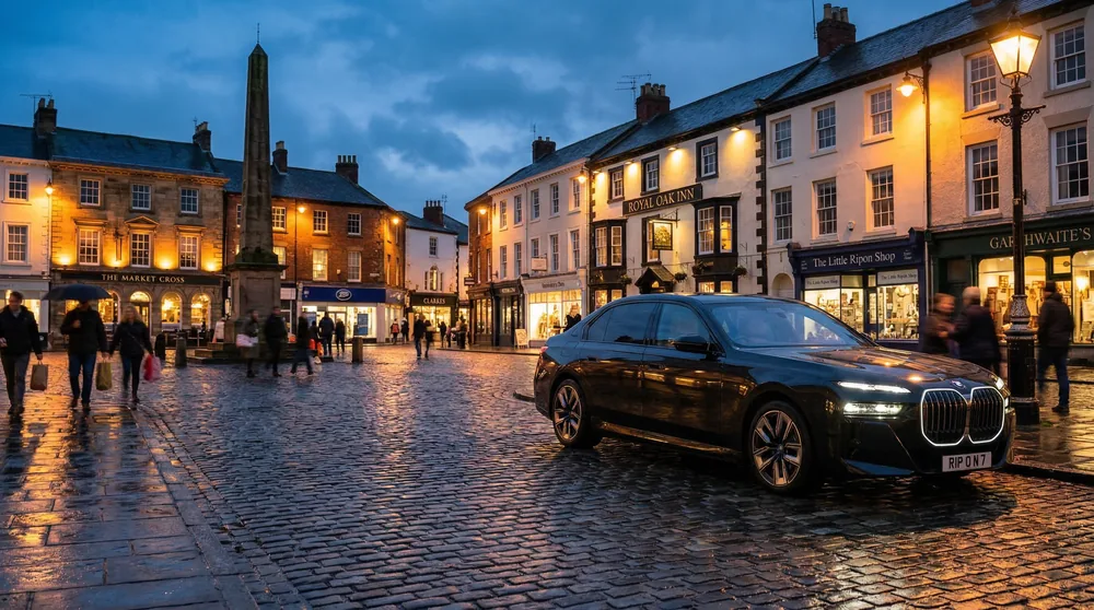 Ripon's ancient Hornblower ceremony takes place every evening at 9pm in the Market Square — a tradition dating back over 1,000 years. A supercar arrival in the Market Square before the ceremony creates a dramatic backdrop.