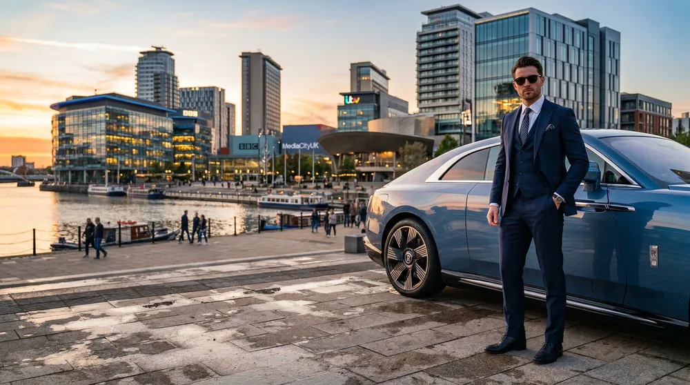 Salford's waterfront development has produced some of the most photographed residential architecture in Greater Manchester. A Rolls-Royce Ghost or Bentley Continental GT positioned outside NV Buildings, Detroit Bridge, or the Lightbox apartments creates lifestyle imagery that property developers and estate agents use to define the aspirational quality of Quays-side living.