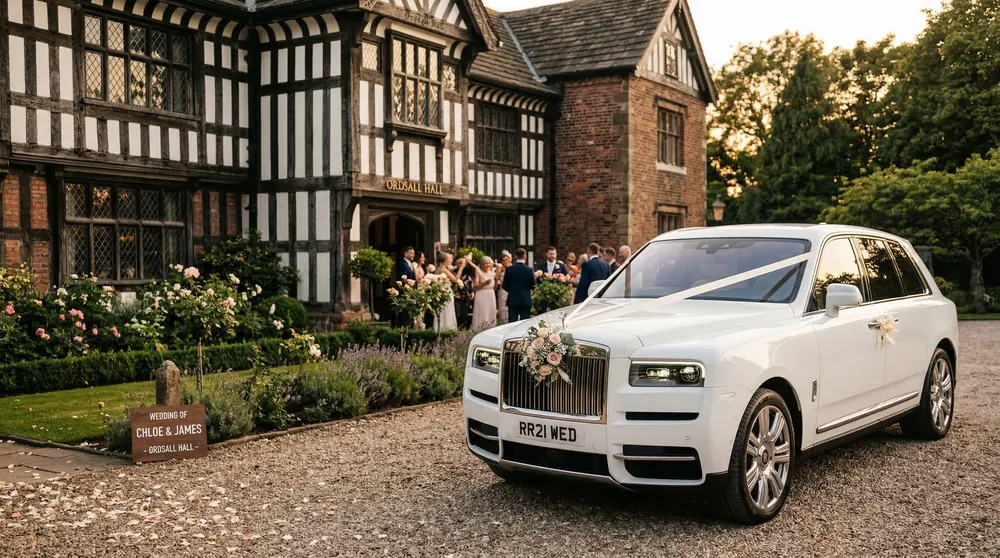 Our Salford wedding collection includes the Rolls-Royce Phantom (from £1,400/day), Rolls-Royce Ghost (from £1,100/day), Bentley Flying Spur (from £950/day), Bentley Continental GTC (from £1,050/day), Ferrari 488 GTB (from £1,100/day), Lamborghini Huracan Evo (from £1,050/day), Aston Martin DB11 (from £899/day), and the Range Rover Autobiography (from £750/day). Every wedding vehicle is presented with complimentary ribbons, a full interior detail, and coordination with your venue events team. Our Salford chauffeurs know the approach drives, turning circles, and photography positions at The Lowry Hotel, Victoria Warehouse, fivefourstudios on Chapel Street, The Court House in Worsley, AJ Bell Stadium in Eccles, and the Imperial War Museum North waterfront. Self-drive arrangements include a full orientation so the couple drives to the reception with complete confidence.