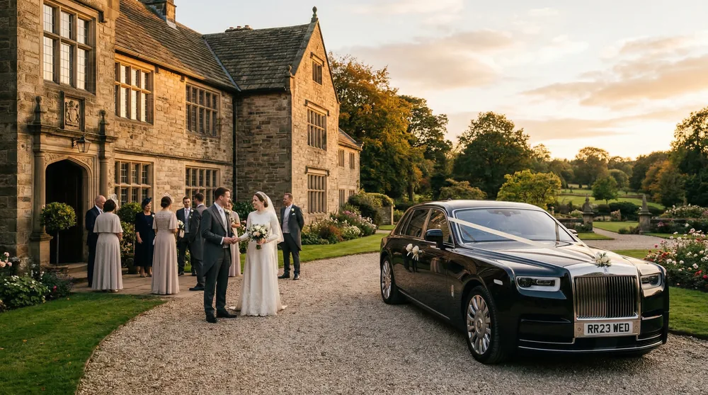 Whitley Hall (S35 8NR) is Sheffield's premier country house wedding venue, a 16th-century manor set in 20 acres of gardens and woodland north of the city in Grenoside. The approach through the private drive between mature oaks and across the stone bridge creates the defining arrival moment of any Sheffield wedding. A Rolls-Royce Phantom arriving at the Tudor portico — the honey-coloured stonework framing the vehicle perfectly — delivers the grandeur that a 500-year-old manor house demands. Our chauffeurs coordinate with Whitley Hall's events team to time the arrival precisely: guests gathered on the front lawn, photographer positioned at the stone balustrade, and the Phantom drawing to a halt as the reception begins.