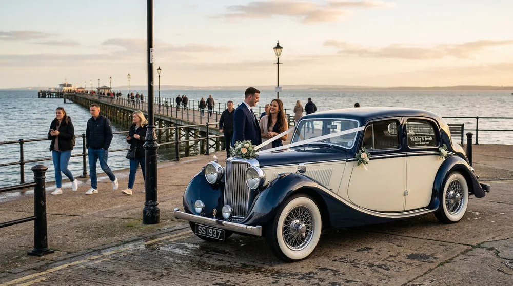 Our vintage fleet serves all Southend-on-Sea postcodes and the wider south Essex area. Standard coverage includes: Southend town centre, Westcliff-on-Sea, Leigh-on-Sea, Chalkwell, Prittlewell, Southchurch, Thorpe Bay, Shoeburyness, Eastwood, Rochford, Rayleigh, Hadleigh, Benfleet, Canvey Island, Hockley, and Great Wakering. Venue delivery to Muthu Westcliff Hotel, Old Leigh, Southend Pier, Priory Park, and heritage churches throughout the borough is within standard range. Extended coverage to Chelmsford, Basildon, Colchester, and London is available on request. Browse our full vintage collection or explore all Southend-on-Sea hire services.