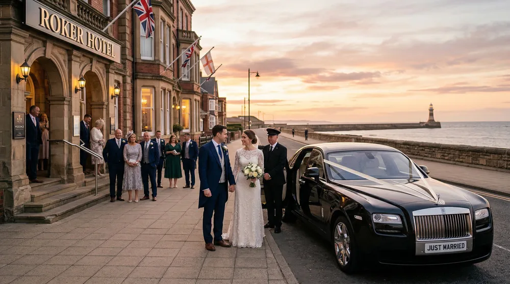 LuxuryCarHire.Club offers wedding car hire in Sunderland, Tyne and Wear. Rolls-Royce Ghost, Bentley Flying Spur, Bentley Continental GTC from £899/day. Lumley Castle — a 14th-century fortress in Chester-le-Street — hosts weddings in its medieval Great Hall. The Roker Hotel sits on the Sunderland seafront, Ramside Hall offers 350 acres of Durham countryside, and the Grand Hotel provides five function rooms in the city centre. Wearside’s wedding circuit spans medieval castles, coastal hotels, and country estates.