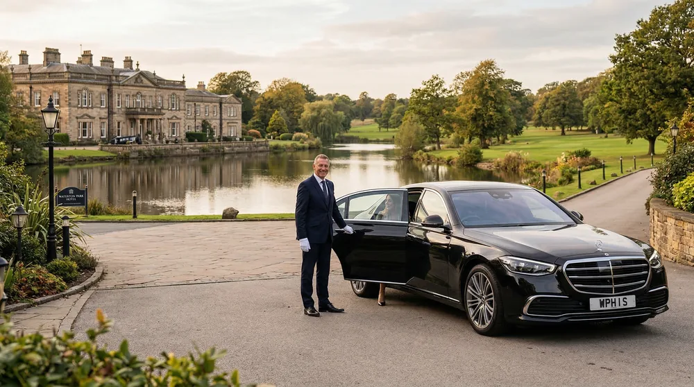 Set in a secluded valley 8 miles south-east of Wakefield, Wentbridge House Hotel is the region's premier country house retreat — a frequent venue for boardroom away-days, private dining and corporate celebrations. Our chauffeurs ensure a distinguished arrival in Bentley or Rolls-Royce, with onward transfers to LBA or any West Yorkshire destination.